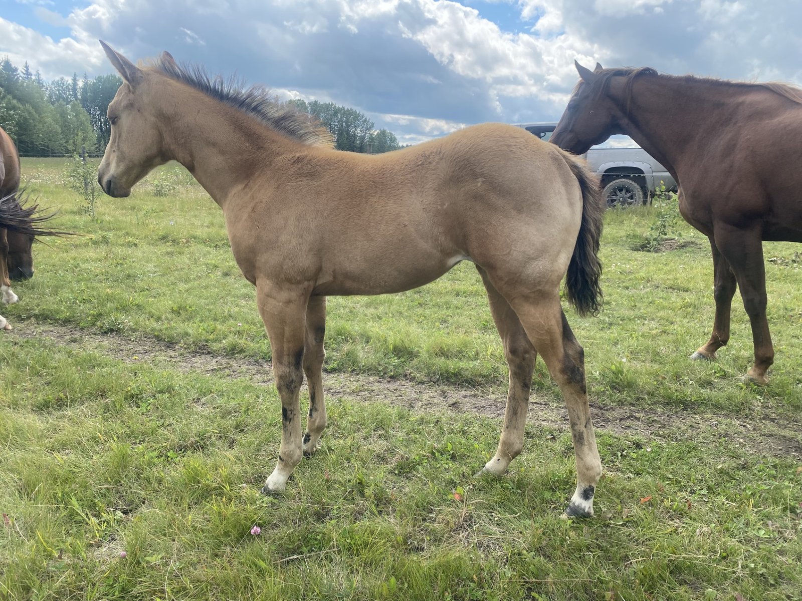 This filly is the definition of stout and muscular. She is trainable and gentle, with a big motor and ability to move (plus she should be able to work a cow). The foal should mature to 14.2-15 hh. This filly has potential to succeed in a number of events such as reining, reined cow horse or barrel racing but would make a stand out roping prospect.